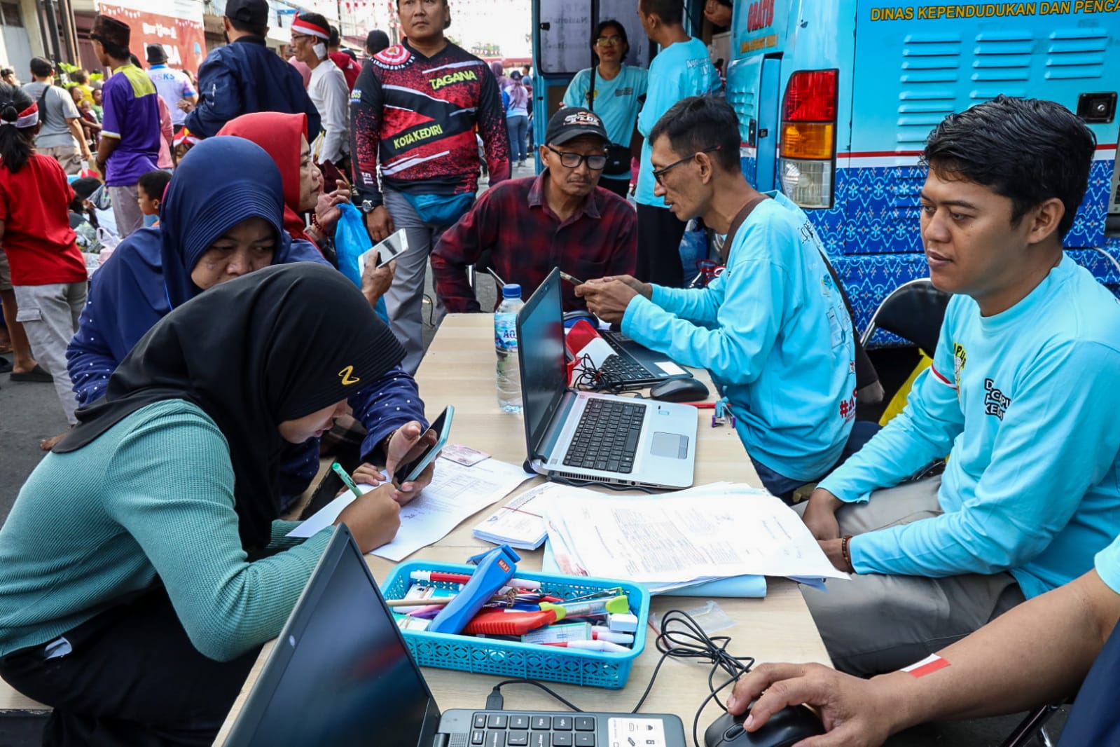 Tasfm.com – Sebagai upaya dalam meningkatkan pelayanan prima kepada masyarakat di bidang administrasi kependudukan (adminduk), Pemerintah Kota Kediri melalui Dinas Kependudukan dan Pencatatan Sipil (Dispendukcapil) turut hadir di tengah-tengah riuh peserta lomba agustusan yang berlangsung di Car Free Day (CFD) Jalan Dhoho, Minggu (10/8). Selain untuk meramaikan suasana, kegiatan tersebut merupakan aksi jemput bola agar memudahkan masyarakat dalam menjangkau pelayanan adminduk.