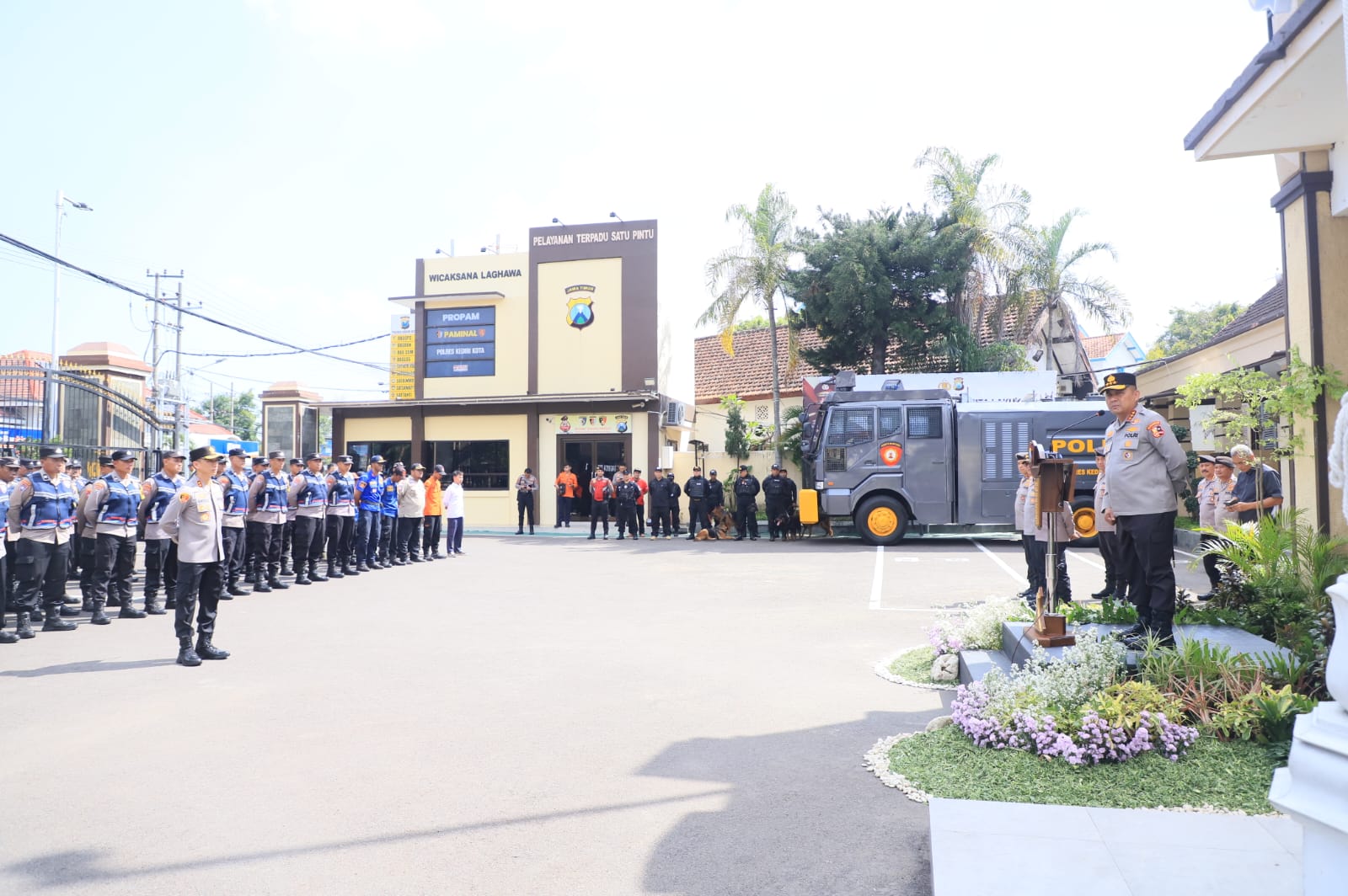 Dalam apel tersebut, Kapolres Kediri Kota AKBP Anggi Saputra Ibrahim bertindak sebagai Komandan Apel. Sementara jajaran pejabat utama Polri dan Polda Jawa Timur turut hadir mendampingi, di antaranya Dirbintibmas Korbinmas Brigjen Pol. Muhammad Rudy Syarifudin dan Dirsamapta Korsabhara Brigjen Pol. Dr. Mokhamad Ngajib.