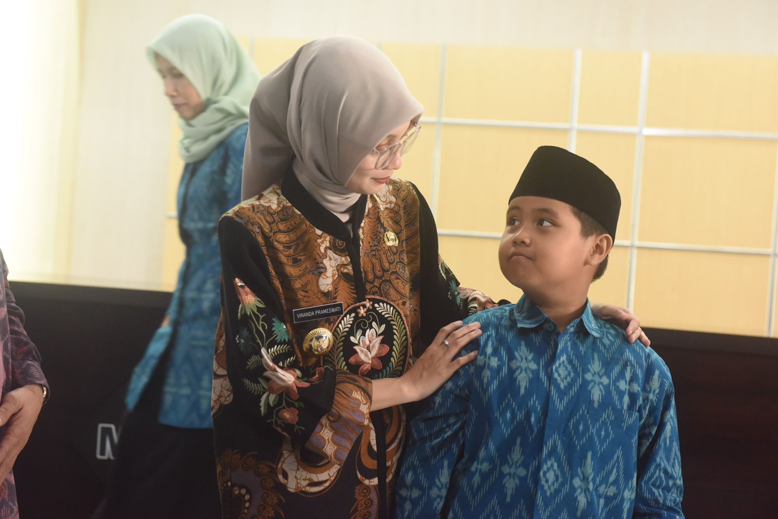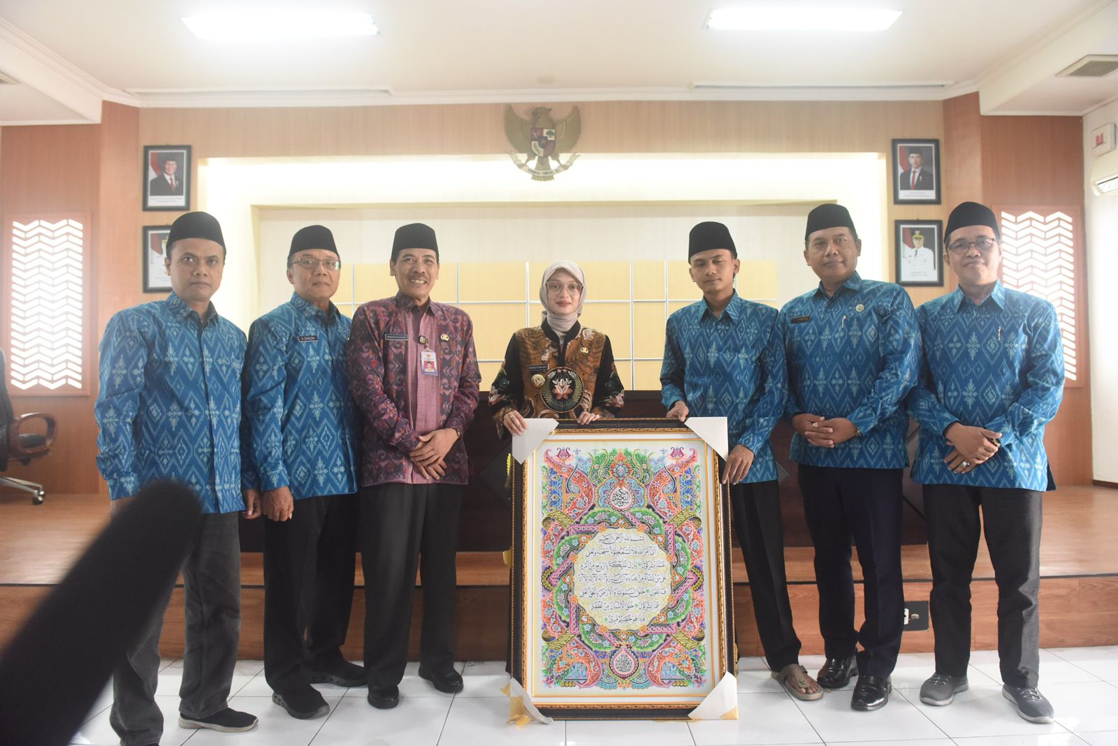 Pada kesempatan ini, Mbak Wali juga menerima cinderamata berupa kaligrafi karya salah satu kafilah dari Kota Kediri. Yakni karya Maftuh Hannan Ahyad dari Cabang Khat Al-Quran. Turut hadir, Asisten Pemerintahan dan Kesra Mandung Sulaksono, Kepala Bagian Kesra Ahmad Jainudin, para pendamping dan official MTQ, dan tamu undangan lainnya.
