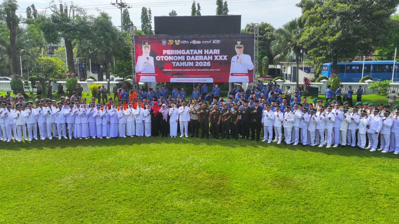 Tasfm.com – Wali Kota Kediri Vinanda Prameswati bertindak sebagai inspektur upacara dalam peringatan Hari Otonomi Daerah yang digelar di Halaman Balai Kota Kediri, Senin (27/04/2026). Upacara berlangsung khidmat dan diikuti oleh jajaran Aparatur Sipil Negara (ASN), TNI, Polri, serta pelajar. Dalam upacara ini, Wali Kota Kediri juga membacakan Amanat Menteri Dalam Negeri.