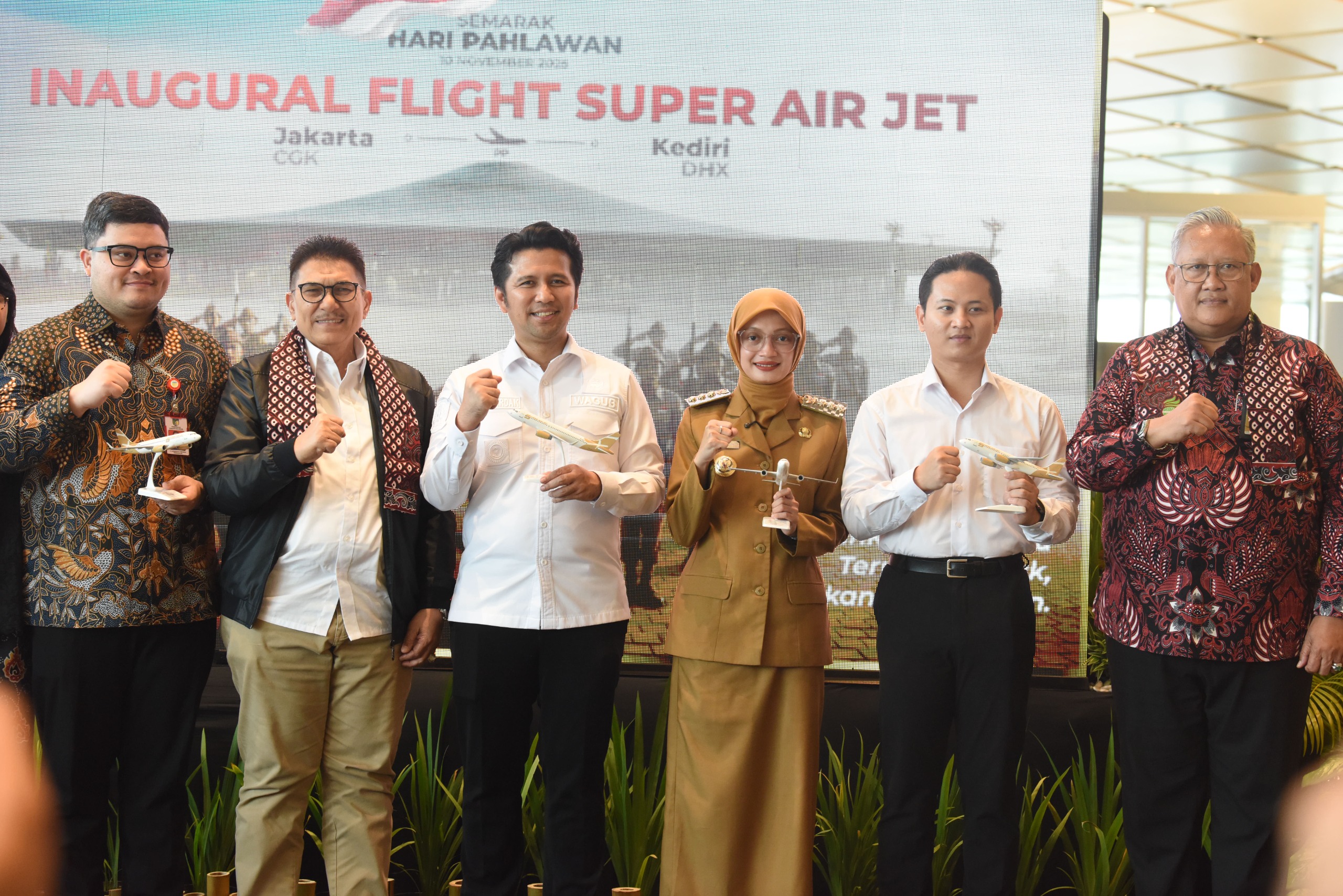Dalam kesempatan itu, Wakil Gubernur Jawa Timur Emil Elestianto Dardak juga menyampaikan rasa syukur atas kembali beroperasinya Bandara Dhoho Kediri. “Hari ini, bertepatan dengan Hari Pahlawan, kami akan menggunakan penerbangan ini ke Jakarta, jadi tukeran sama Mas Bupati Trenggalek, yang baru saja mengikuti penerbangan rute Jakarta-Kediri. Hari ini salah satu bandara utama di Jawa Timur juga resmi dilayani oleh Super Air Jet. Kami sangat berterima kasih,” ujarnya.