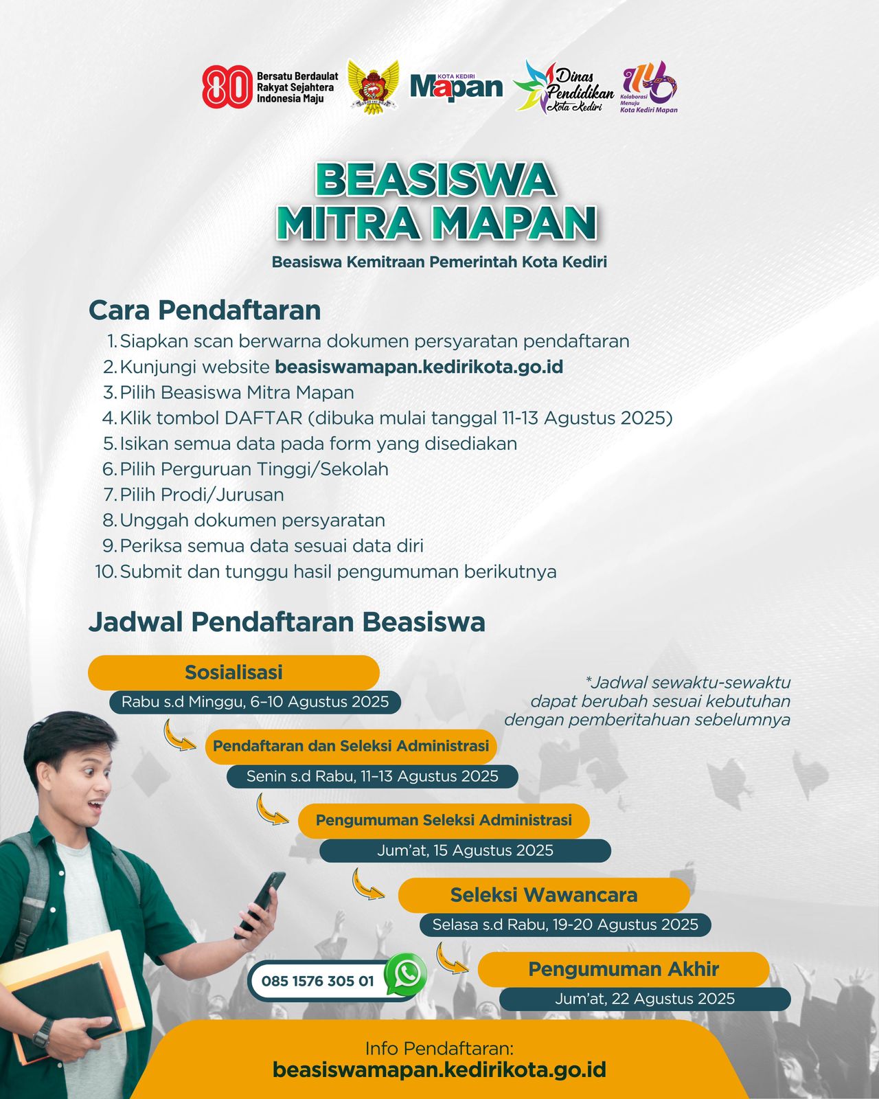 “Kami yakin pendidikan menjadi kunci utama dalam membentuk generasi yang unggul, berkarakter dan siap menghadapi tantangan global. Salah satunya melalui program Beasiswa Mitra MAPAN. Dimana program ini merupakan kemitraan antara Pemerintah Kota Kediri dan Perguruan Tinggi,” ujarnya.
